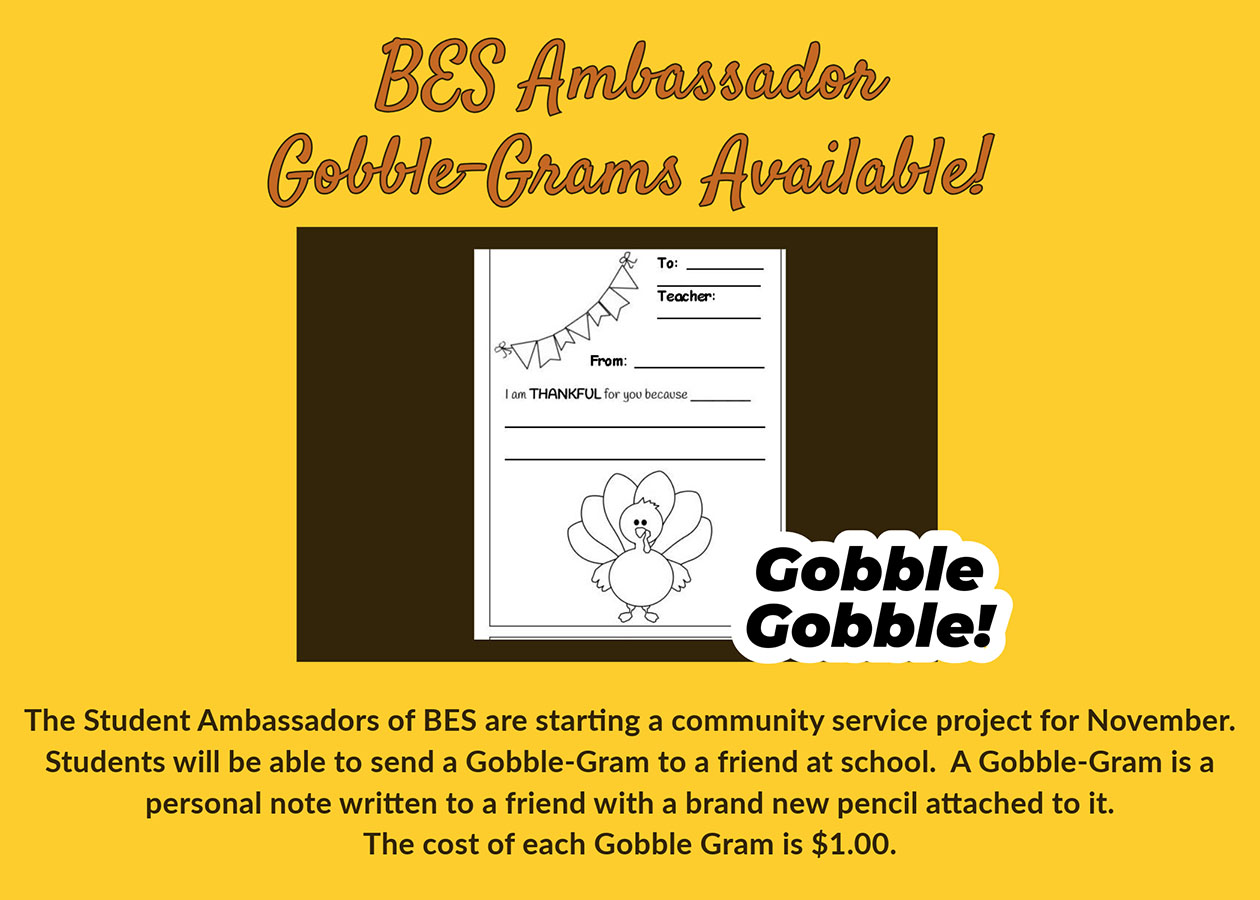 The Student Ambassadors of BES are starting a community service project for November. Students will be able to send a Gobble-Gram to a friend at school. A Gobble-Gram is a personal note written to a friend with a brand new pencil attached to it.
