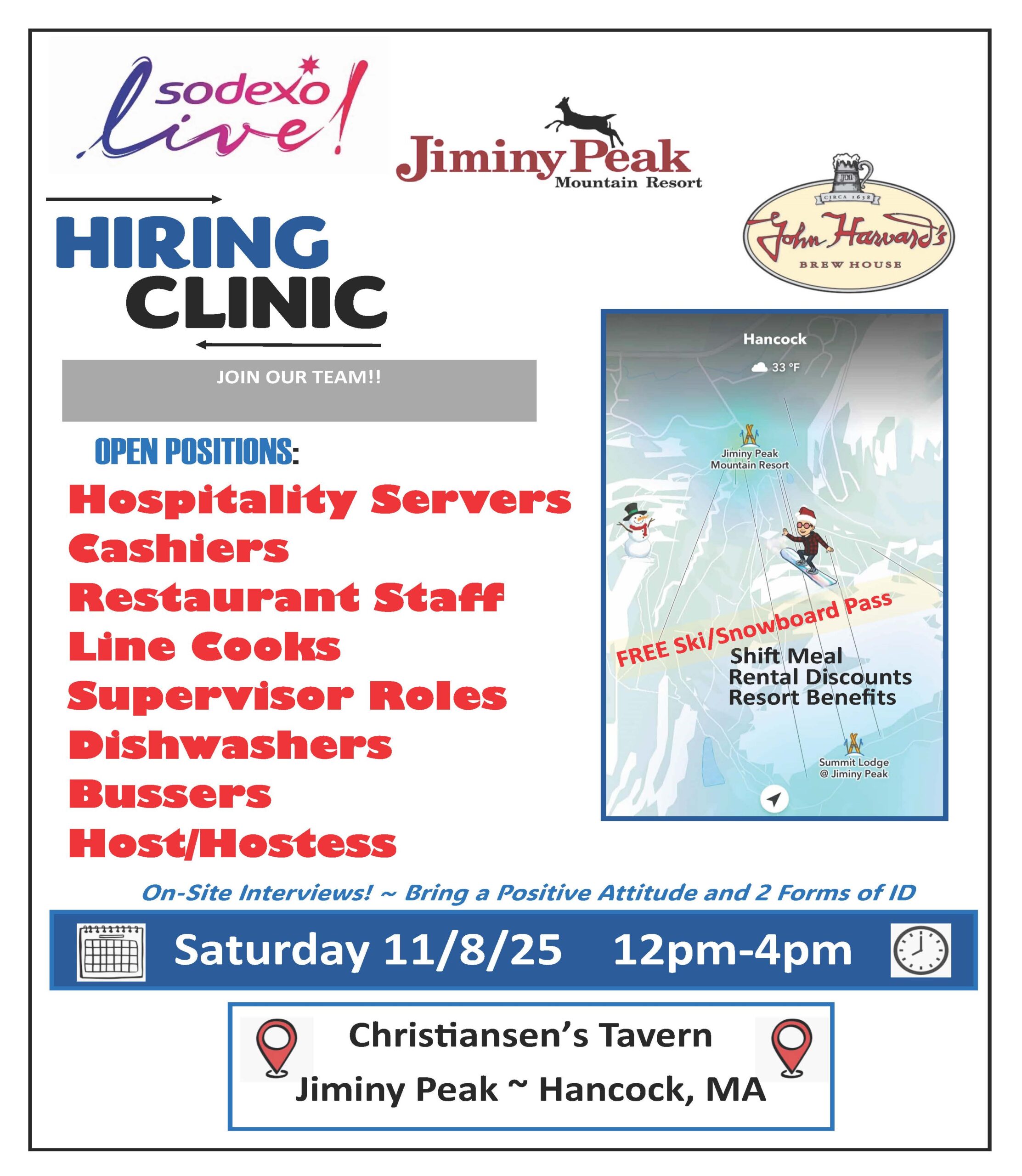 Attn BHS: Jiminy Peak Mountain Resort will host a hiring clinic on Saturday, November 8 from 12pm-4pm at Christiansen’s Tavern. Many food service positions are available. It’s a great opportunity to earn money and ski for free! Get your working papers from the Guidance Office, complete them to obtain your work permit before the hiring clinic, and you’ll be ready to apply. More information is on the attached flier.