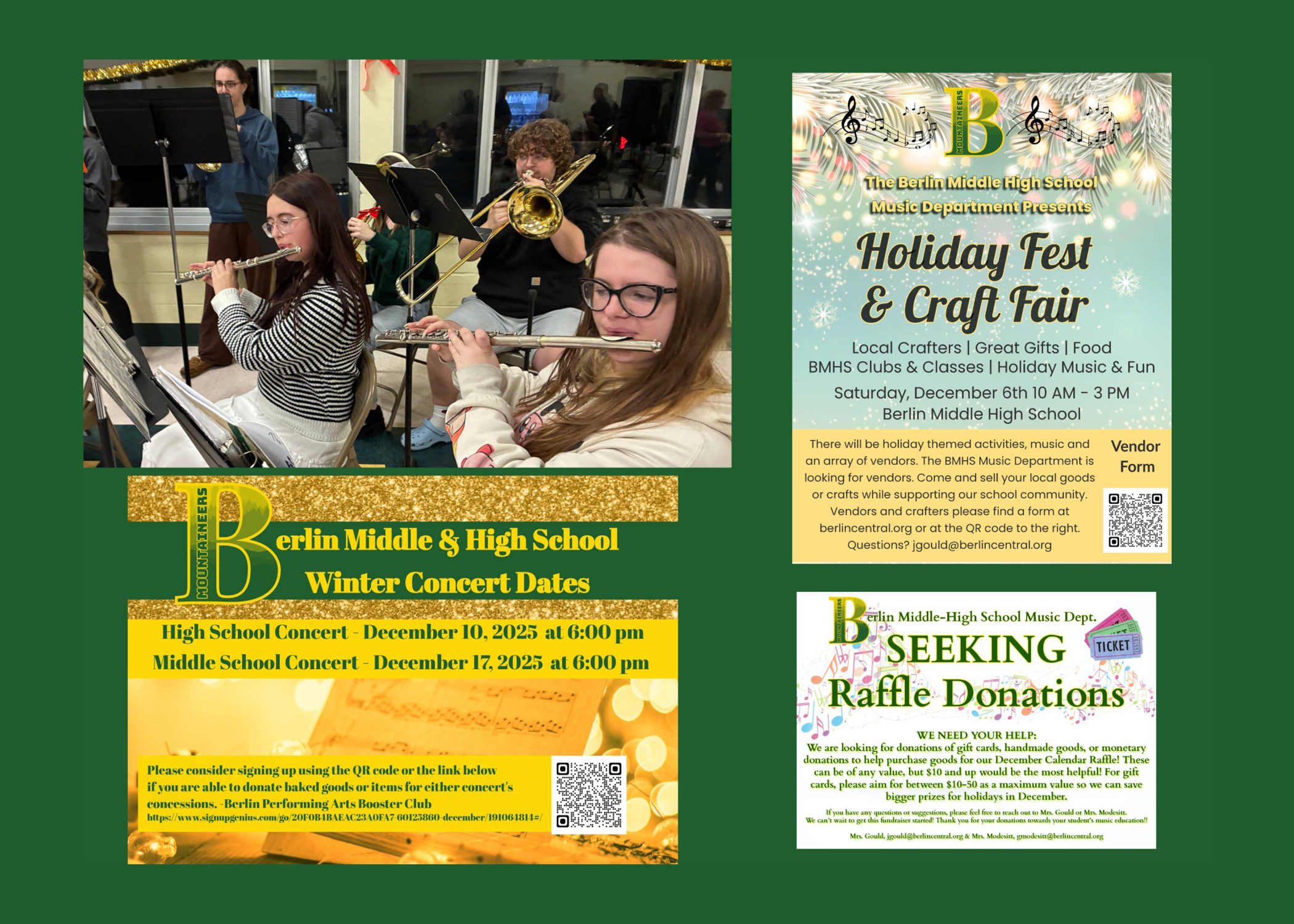 Thank you to the Berlin Performing Arts Booster Club (BPABC) for their tremendous support in helping to make these upcoming events possible. Reach out to BPABC at bpaboosterclub@gmail.com to join their efforts. Shoutout to all the musicians for their great performance and community members who donated and enjoyed the Chili Cook-off and music. – Mrs. Jessica Gould and Mrs. Gretchen Modesitt, BMHS Music Department
