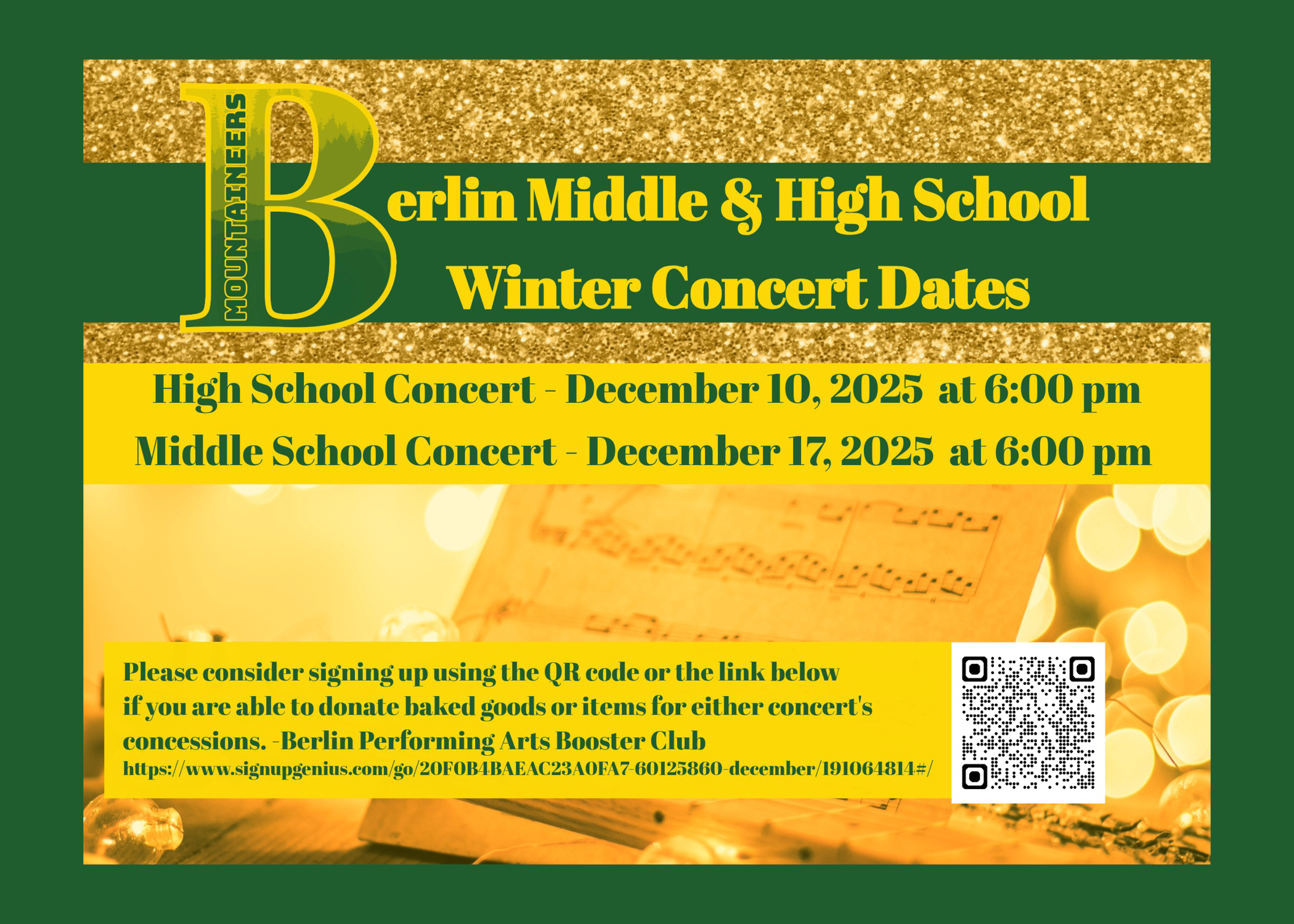 Please consider signing up using the QR code or the link below to donate baked goods or items for either concert’s concessions. Thank you for your support. -Berlin Performing Arts Booster Club, bpaboosterclub@gmail.com