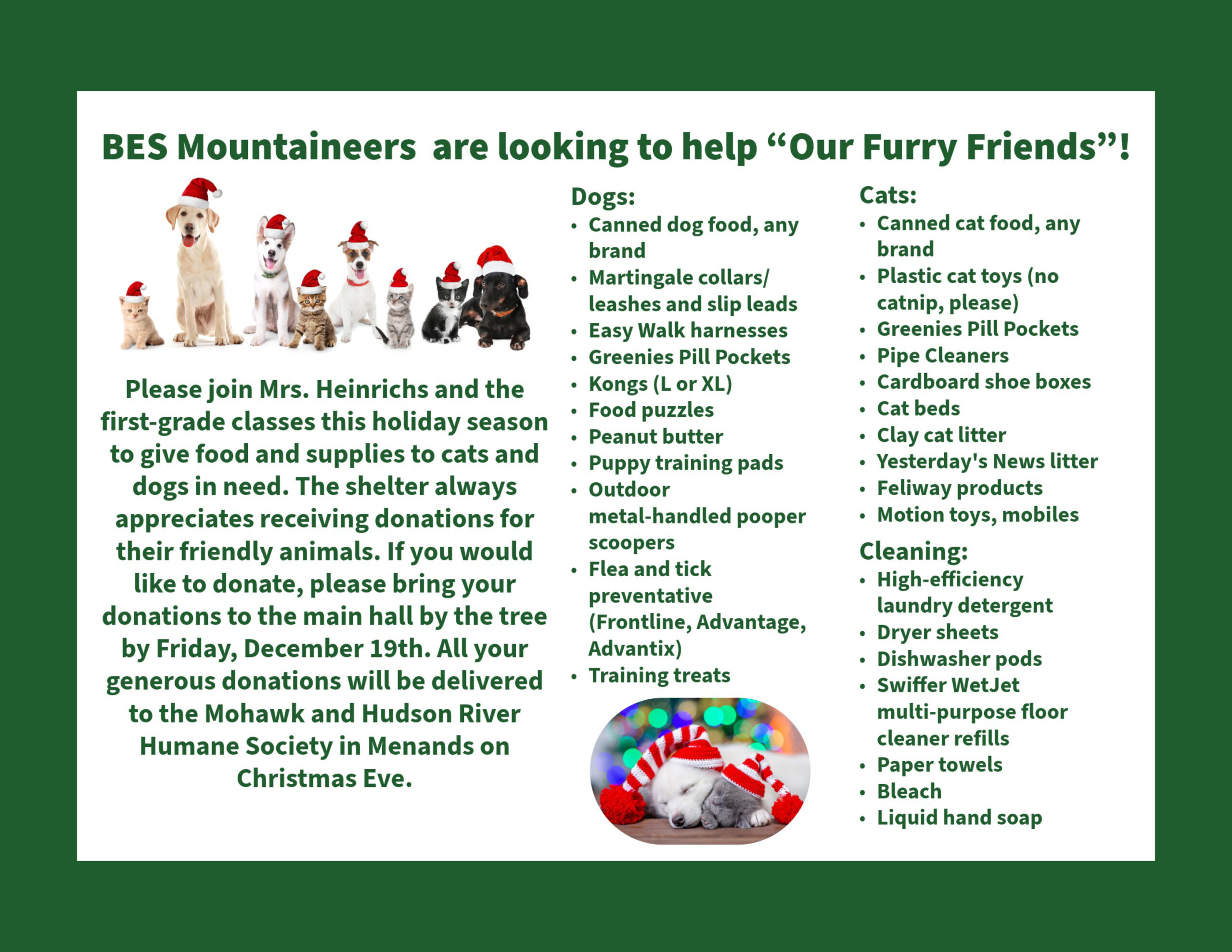 If you would like to donate something, please bring your donations to the main hall by the tree by Friday, December 19th. All of your generous donations will be delivered to The Mohawk and Hudson River Humane Society in Menands on Christmas Eve.
