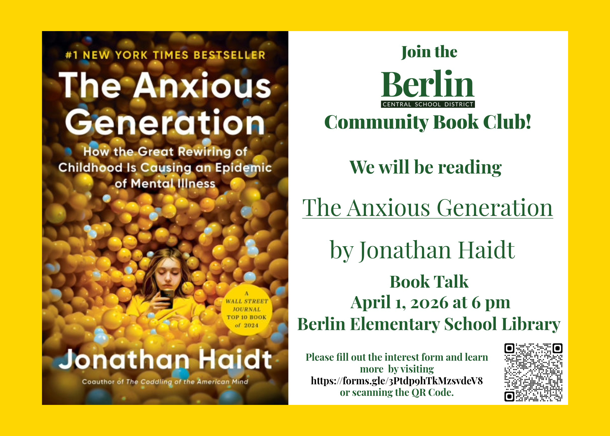 The Book Talk will take place April 1 at 6pm at the Berlin Elementary School Library. Please come with having the book read and ready for some great conversations!