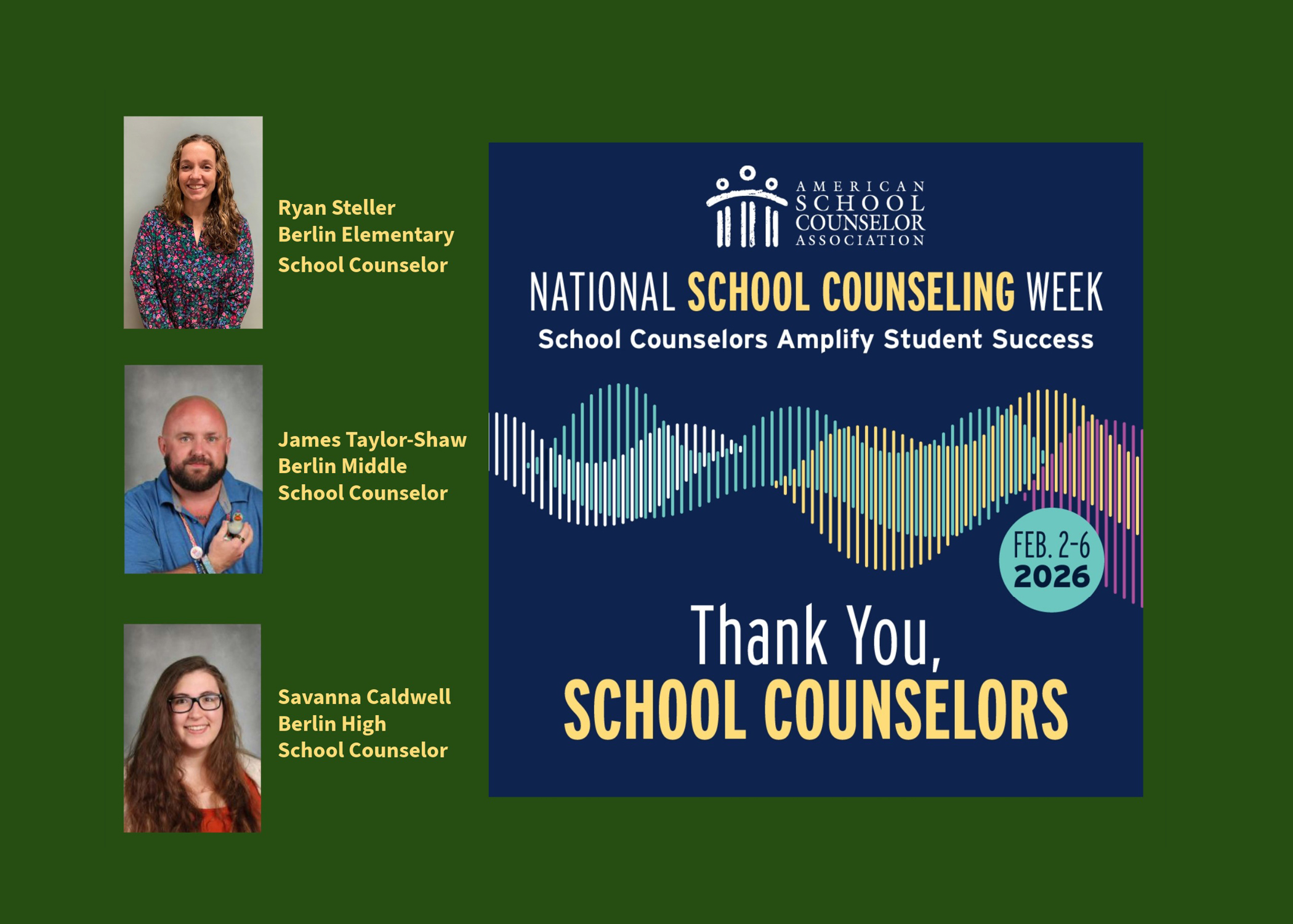 Berlin Central School District would like to take a moment to recognize our school counselors: Ryan Steller, Berlin Elementary School Counselor; James Taylor-Shaw, Berlin Middle School Counselor; and Savanna Caldwell, Berlin High School Counselor. Please take a moment to join us in sharing our gratitude and honoring the work our school counselors do for our school community day in and day out. Thank you BCSD School Counselors!