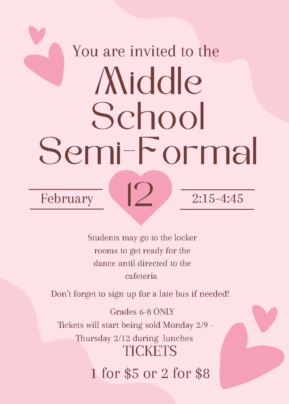 Attention Mountaineers in 6th-8th grade! The BHS 10th Grade Class is hosting a Middle School Semi-Formal on February 12th from 2:15 pm – 4:45 pm. Students may go to the locker rooms to get ready for the dance until directed to the cafeteria. Don’t forget to sign up for a late bus if needed! Grades 6-8 only. Tickets will start being sold Monday, 2/9, and will be on sale until Thursday, 2/12, during lunches. Tickets: 1 for $5 or 2 for $8. Check out the flyer below. – Ms. Caldwell, 10th Grade Class Advisor