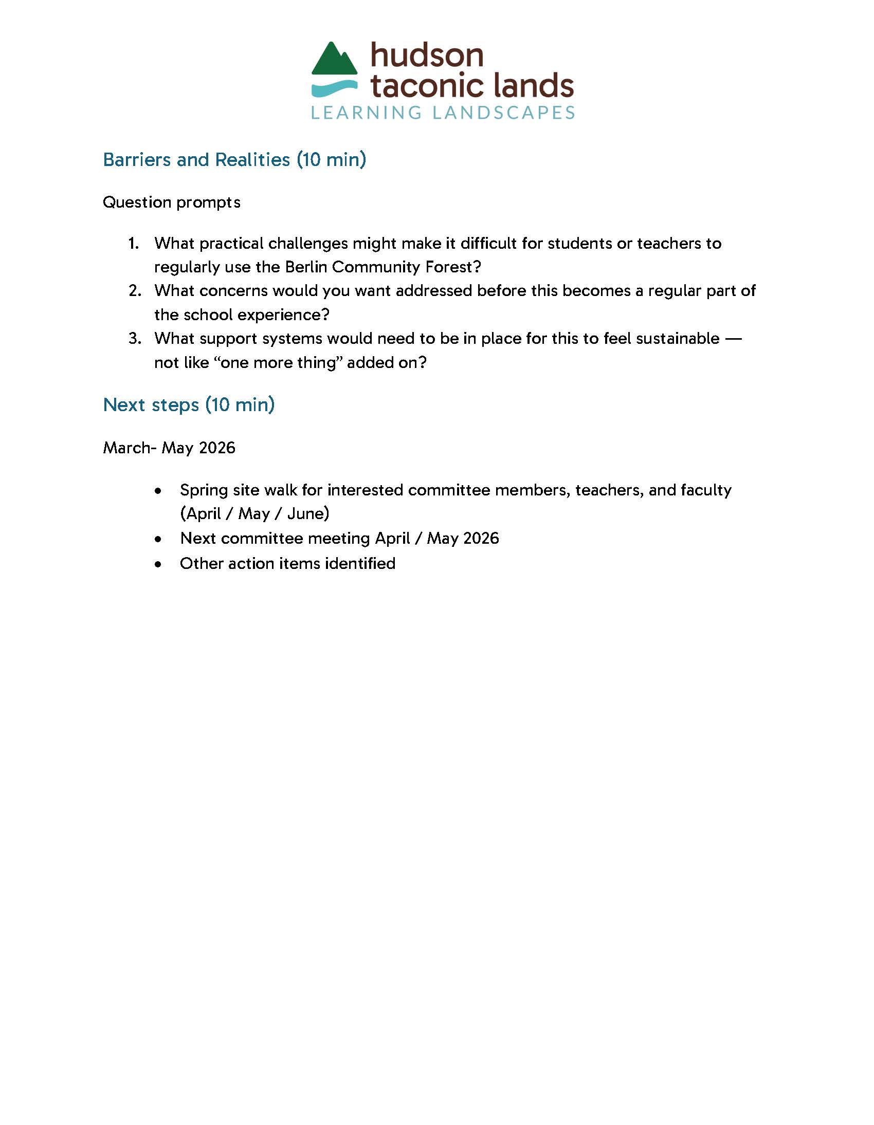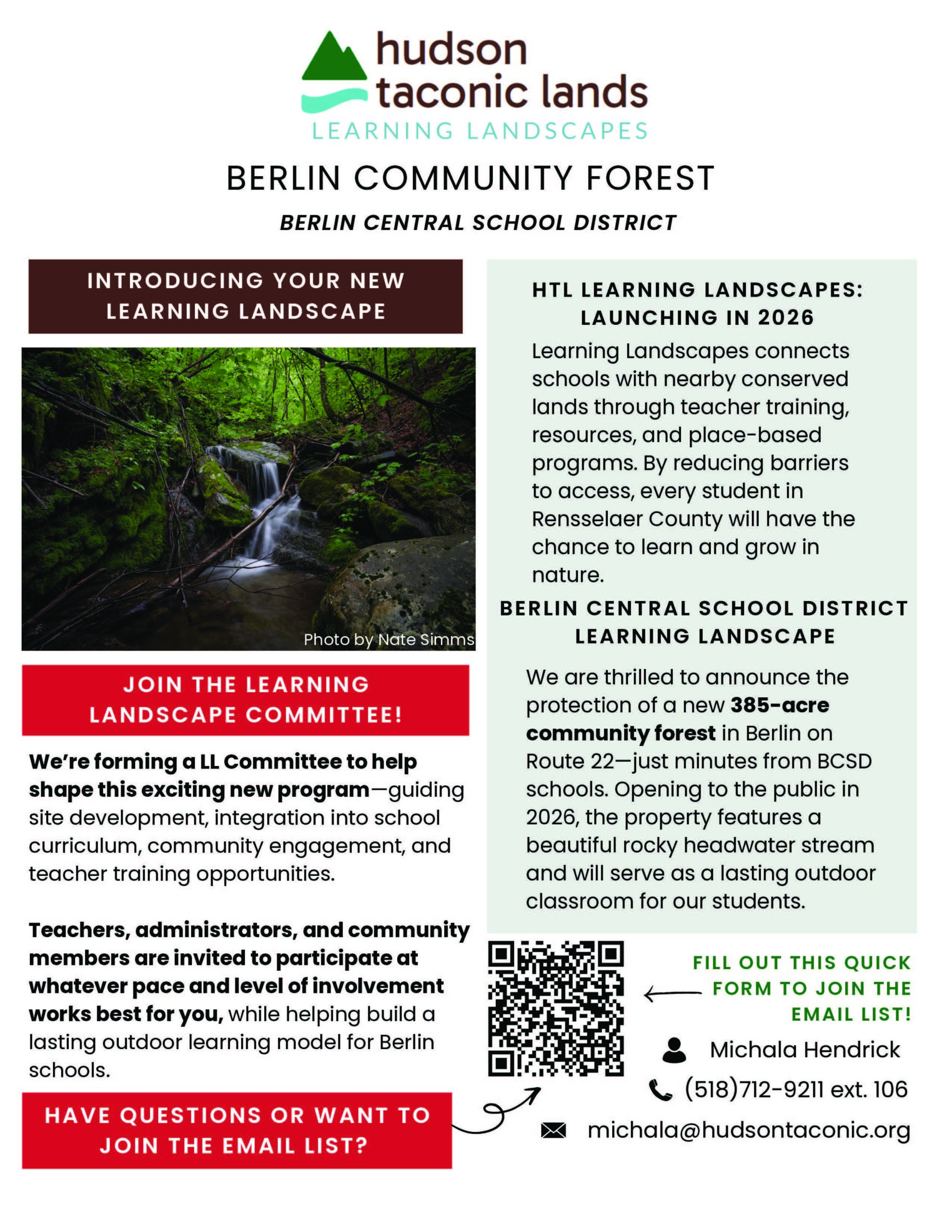 Michala Hendrick, Youth Programming Director, looks forward to sharing more about the work ahead for the Berlin Learning Landscape during the meeting. Please share this with anyone in the Berlin Community or Rensselaer County education network interested in joining the meeting. Attached is a flyer with a QR code or visit this link https://secure.lglforms.com/form_engine/s/OZQq84m-em0na_NgYl1KAg?t=1771884192 to join the email list. The upcoming meeting agenda is attached; feel free to reach out to Michala Hendrick for the meeting link at michala@hudsontaconic.org.