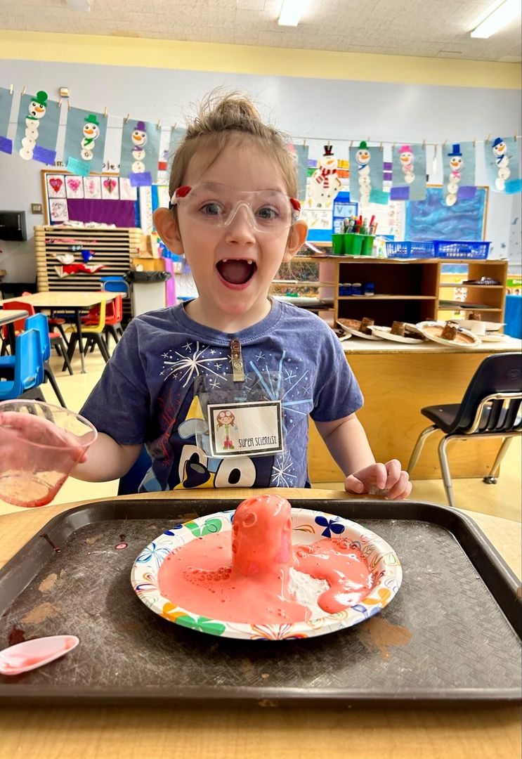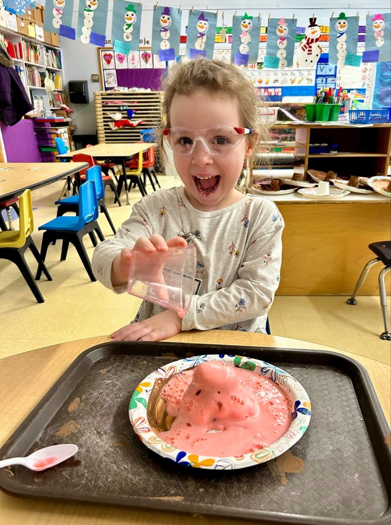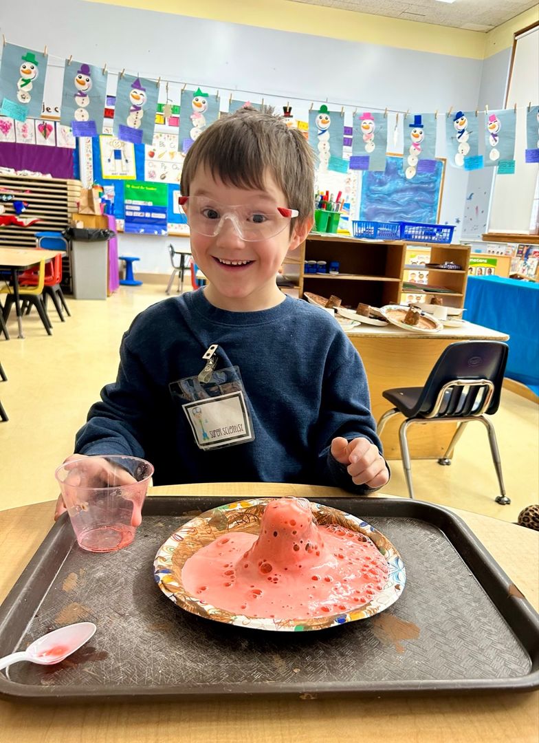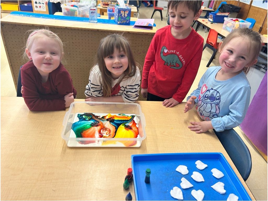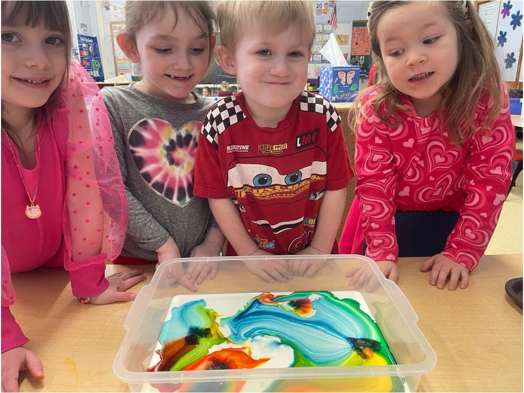 Pre-K Mountaineers in Mrs. Lavoo and Mrs. Kiablick’s classroom have been exploring the joy of STEAM (Science, Technology, Engineering, Arts, and Math) activities. The students recently created their own volcanoes to celebrate the letter V. Before the break, the Mountaineers created a Magic Milk experiment, creating hearts in it for Valentine’s Day. The Magic Milk experiment demonstrates the reaction between soap and fat, and by adding dish soap to milk, the students discovered that the soap molecules chase the fat molecules, creating a colorful explosion!
