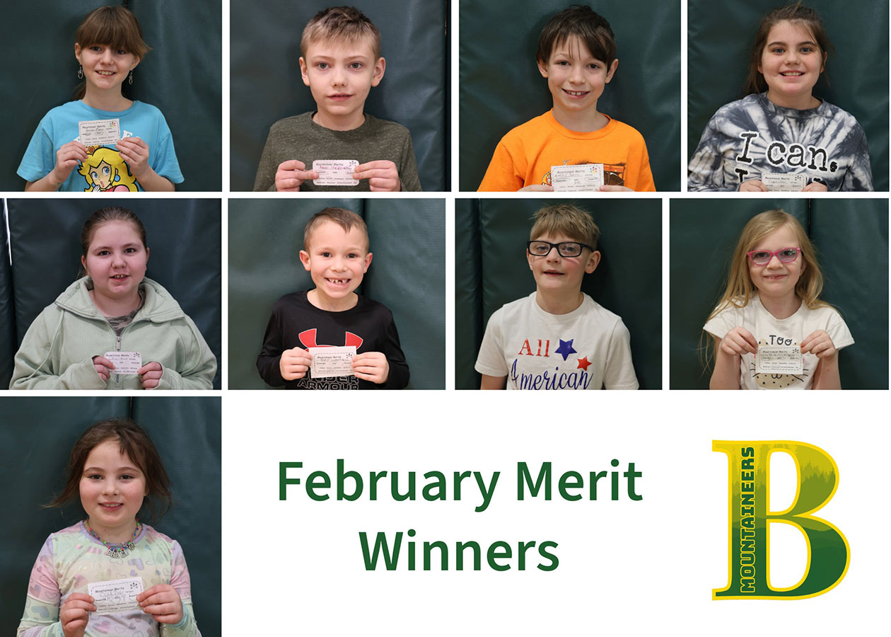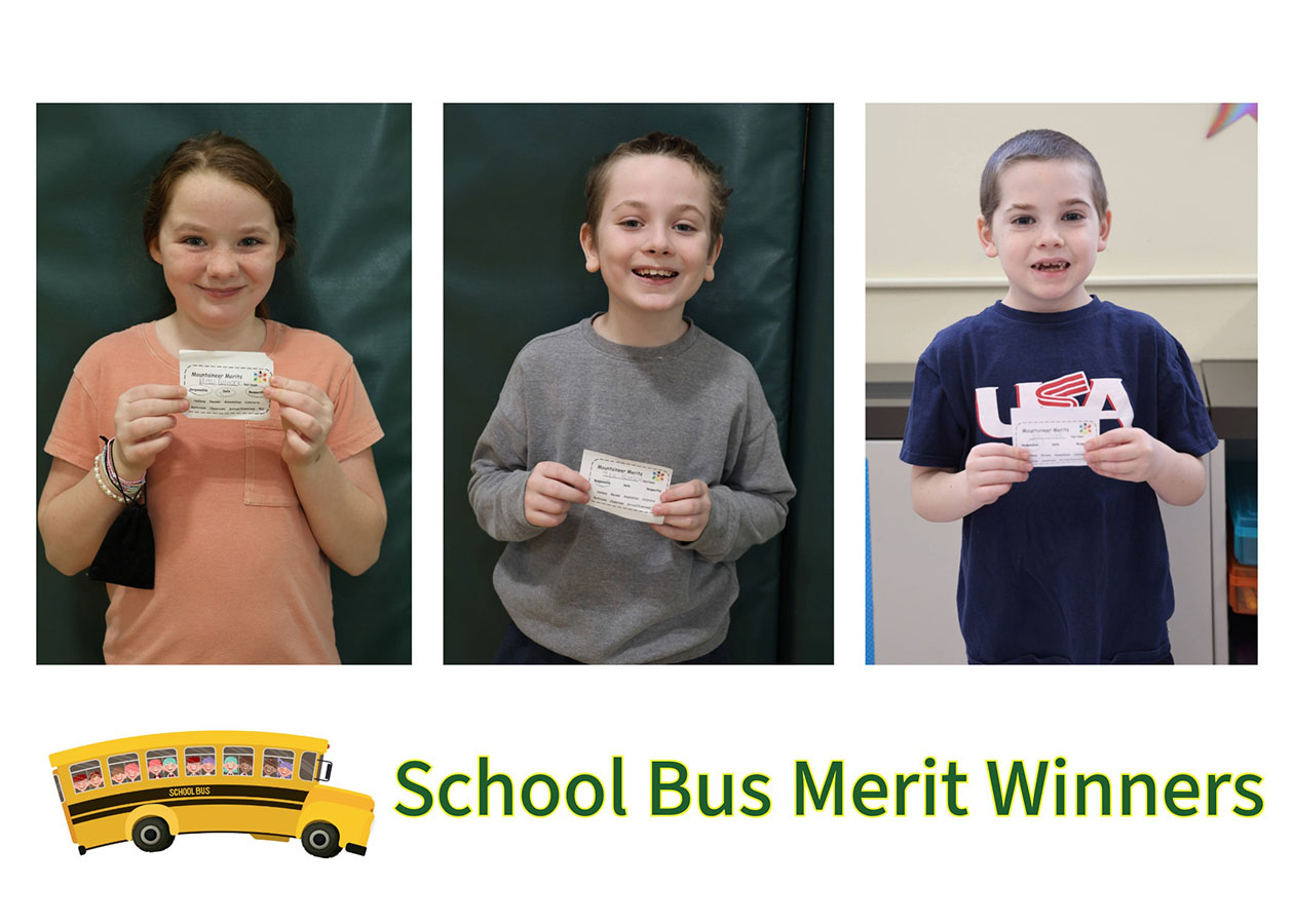 Being a Mountaineer means being responsible, safe, and respectful. Each month, merits are awarded by BES staff and bus drivers to celebrate students who demonstrate these traits. These students are given merits to be deposited in the Mountaineer Merit containers (K-2, 3-5, and bus merits) found in the main hallway. Principal Cataldo randomly draws ten merit recipients (five from kindergarten to second grade and five from third to fifth grade) and three from the bus merit container each month for recognition and a prize.