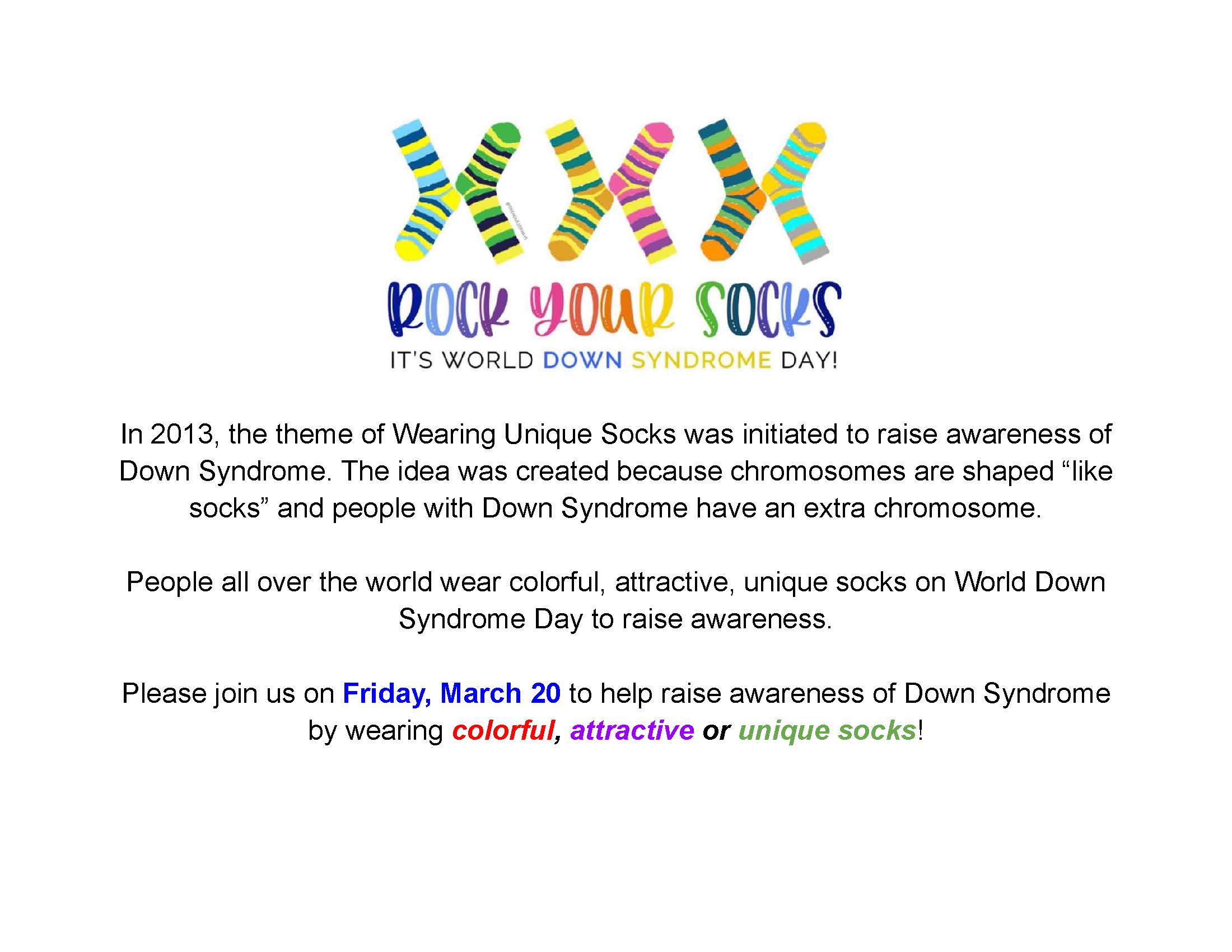Please join us on Friday, March 20 to help raise awareness of Down Syndrome by wearing colorful, attractive or unique socks!