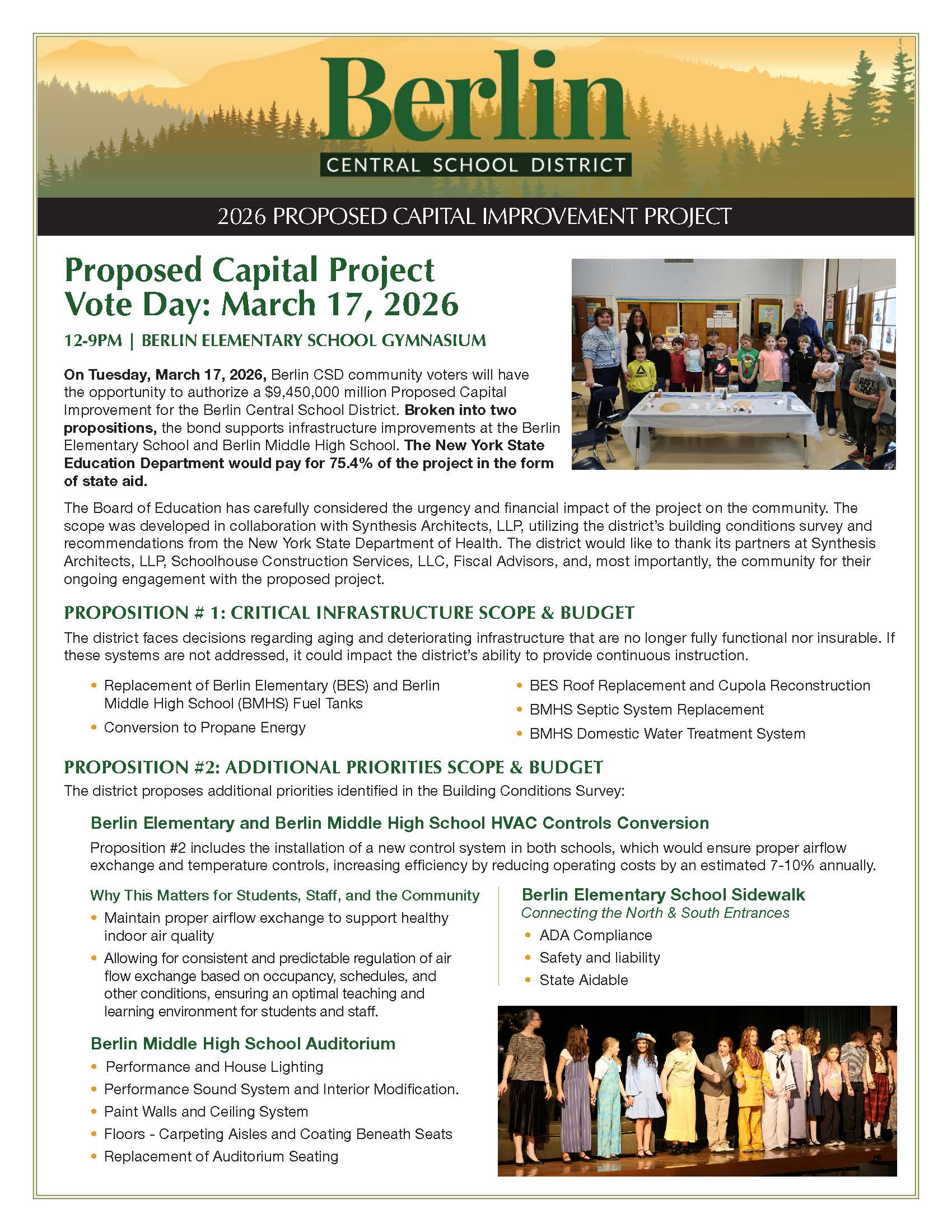 On Tuesday, March 17, 2026, Berlin CSD community voters will have the opportunity to authorize a new $9,450,000 million Capital Improvement for the Berlin Central School District. Broken into two propositions, the bond supports critical infrastructure improvements for Berlin CSD buildings and grounds.