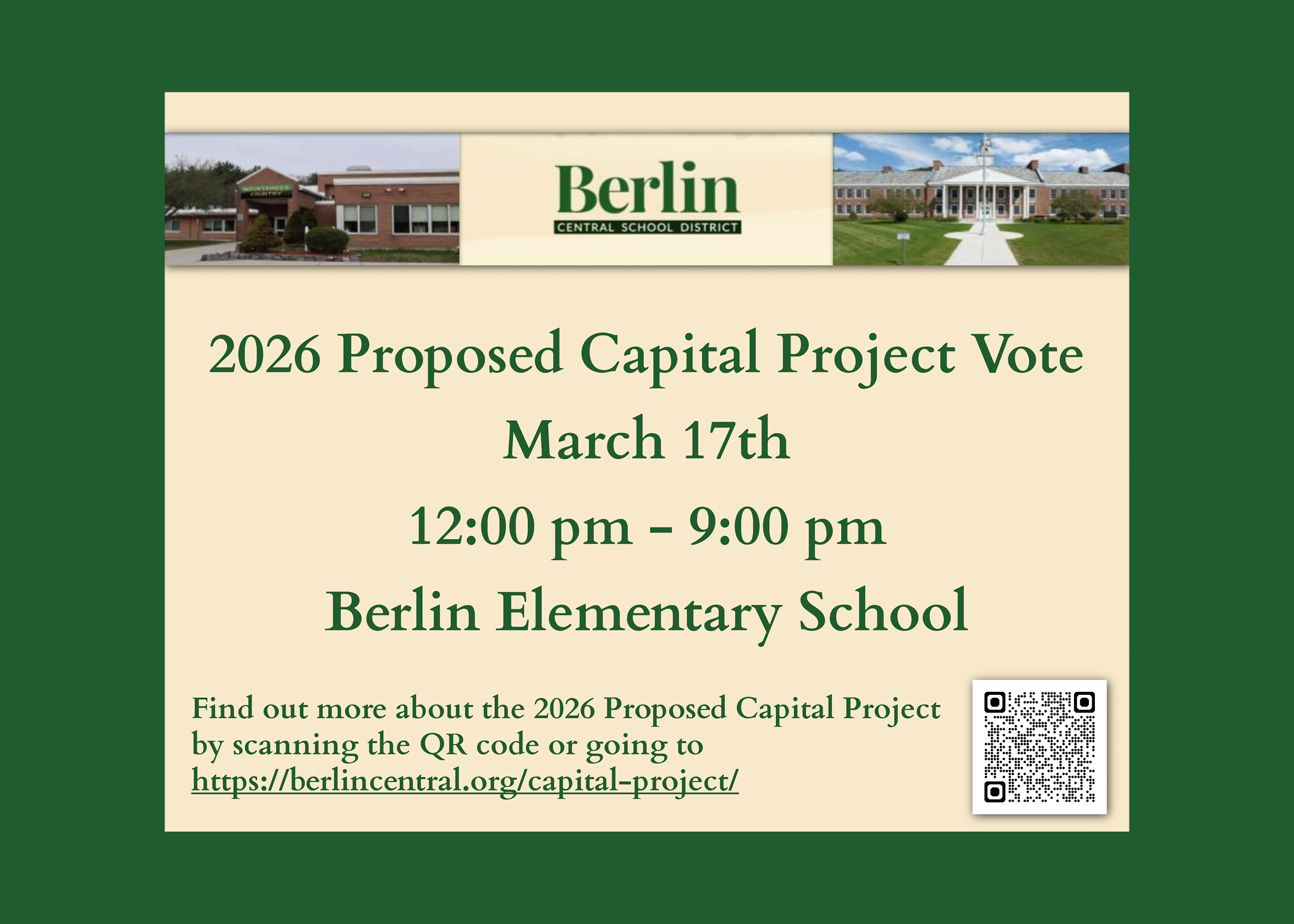 Tomorrow, March 17, 2026, from 12:00 pm to 9:00 pm at Berlin Elementary School, is the Berlin CSD proposed capital project vote. Please find Superintendent Rizzo’s 2-part video series here and learn more about the project to help make an informed decision.