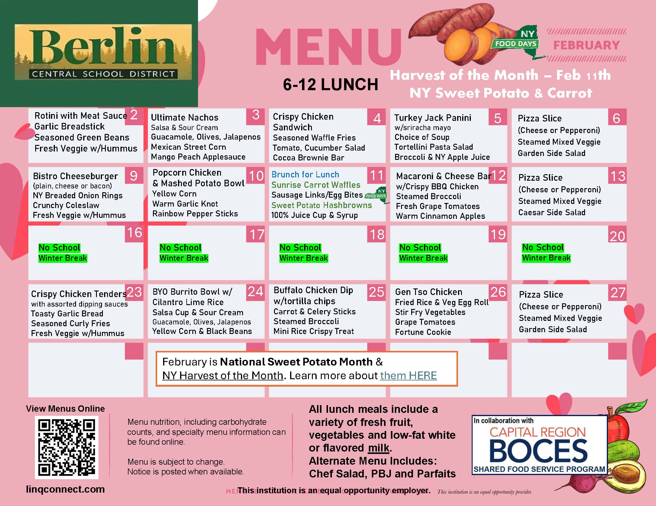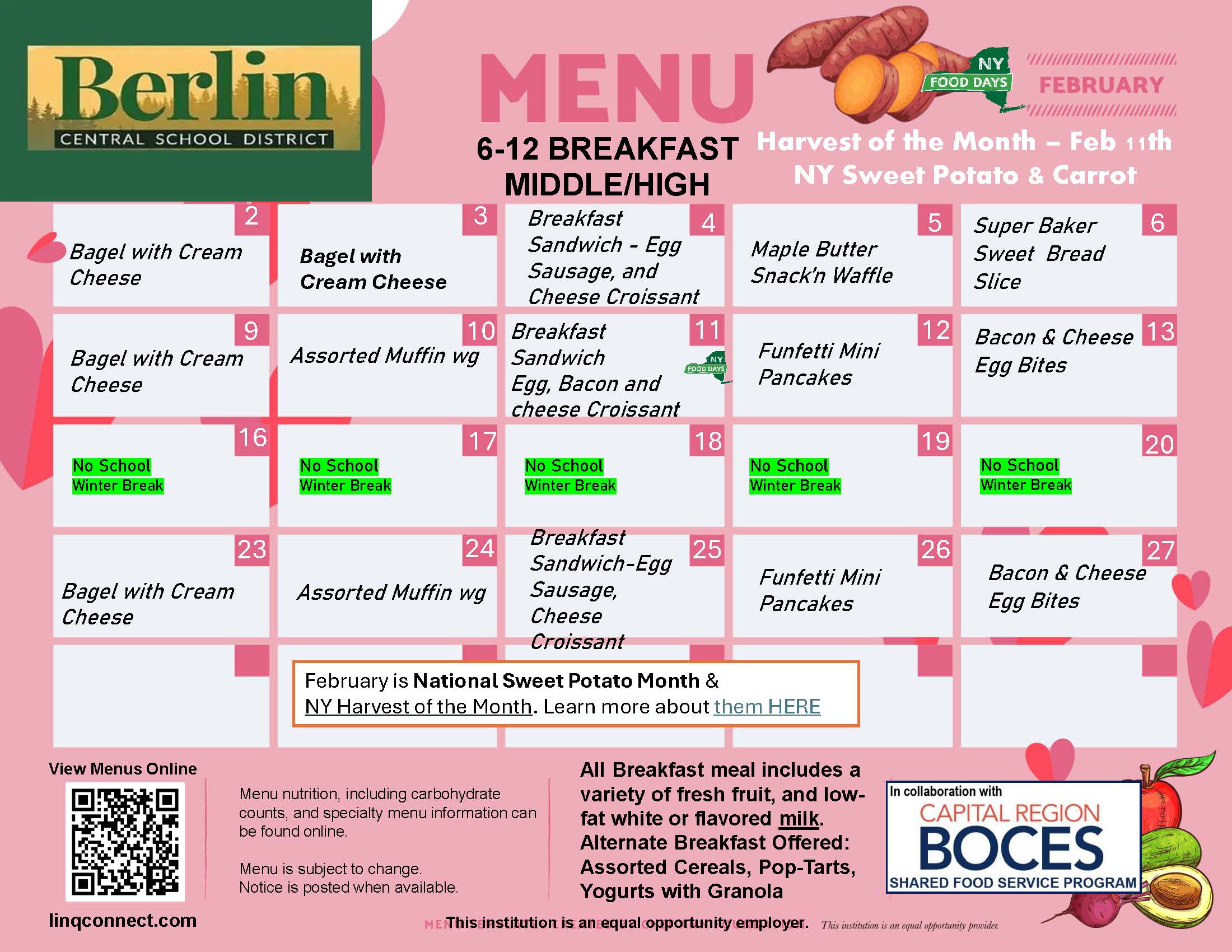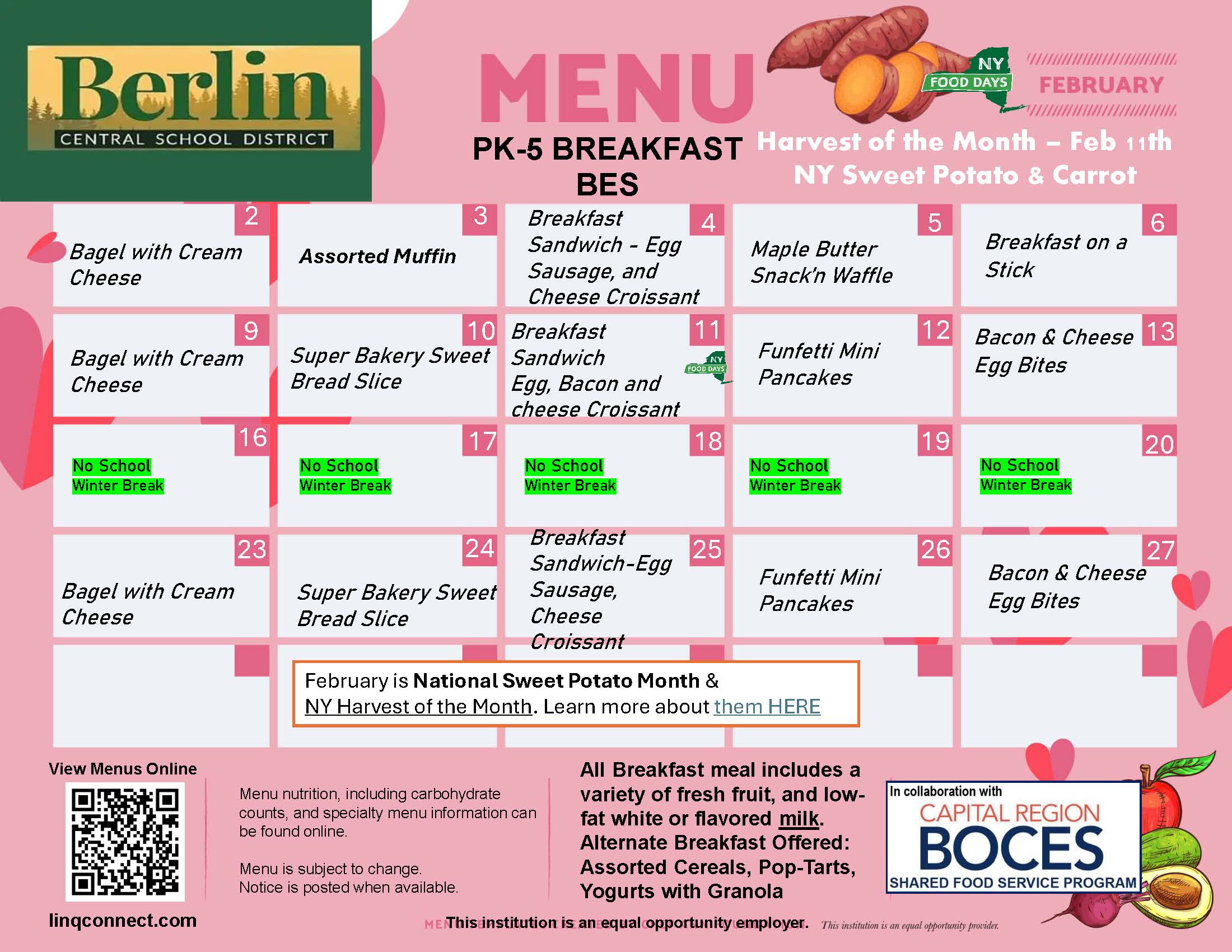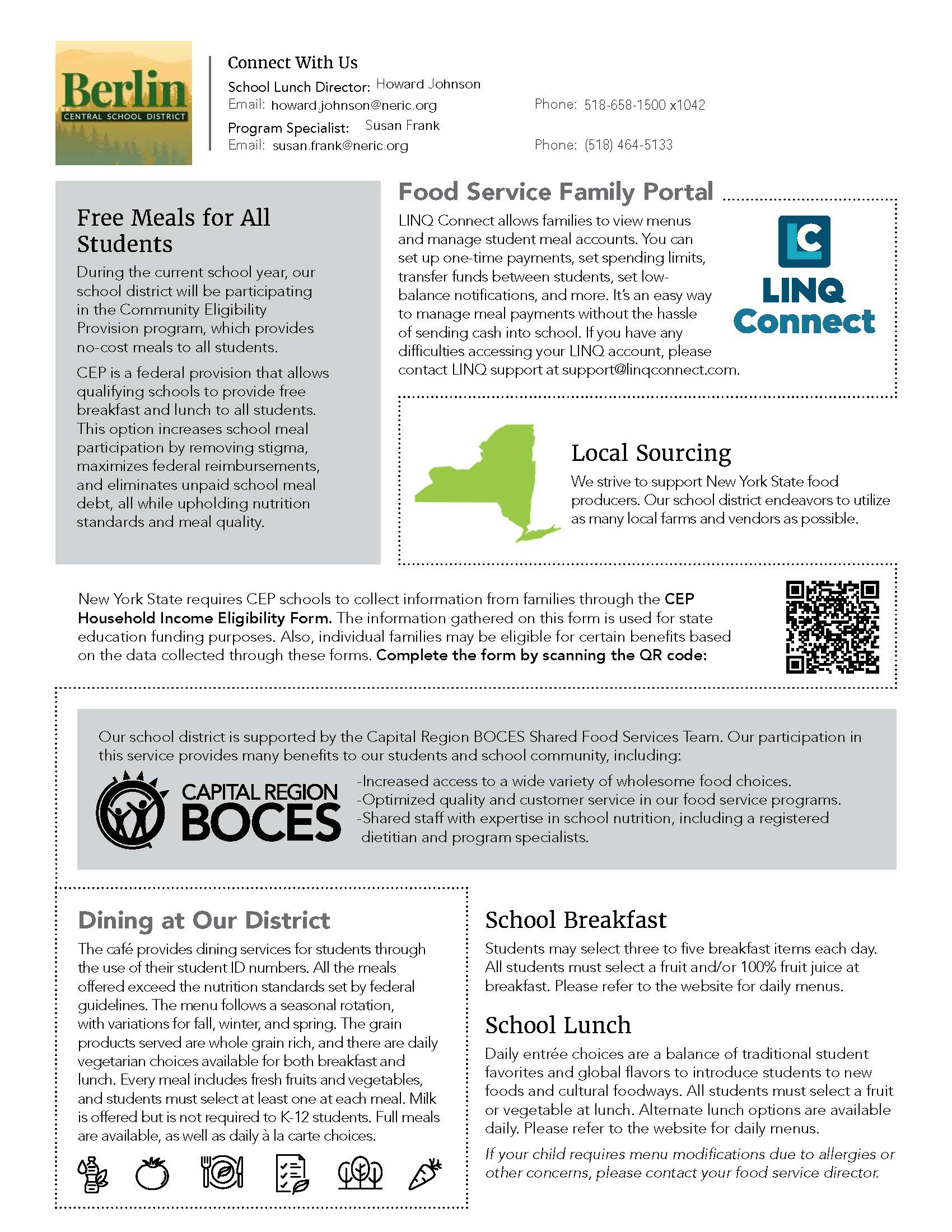 All Berlin Central School District students are eligible to receive FREE school meals (1 breakfast and 1 lunch per day), regardless of family income, through the Community Eligibility Provision (CEP). Additional meals, snacks and a la carte items will still need to be paid for. Students will be able to purchase those items with cash or funds available on their LINQ Connect accounts.