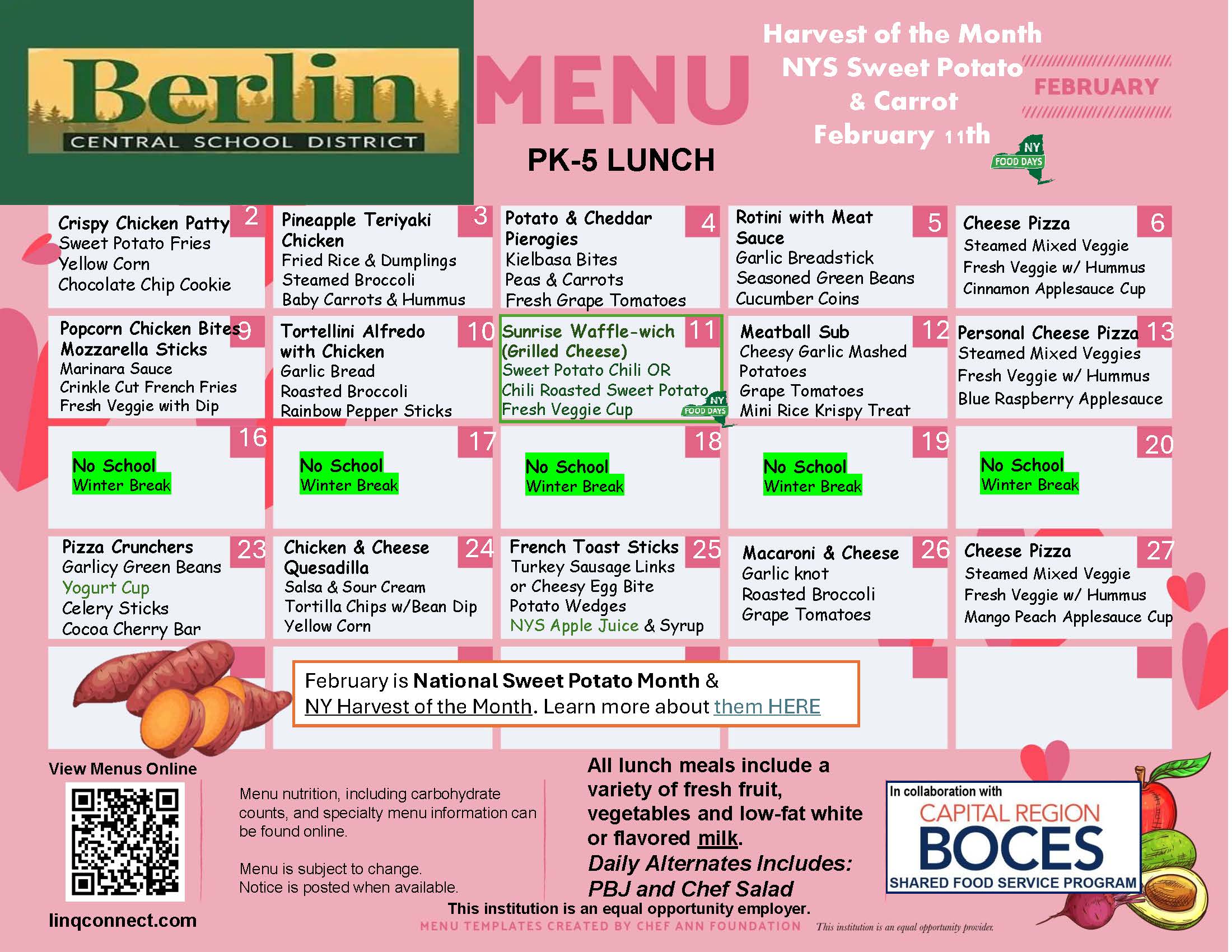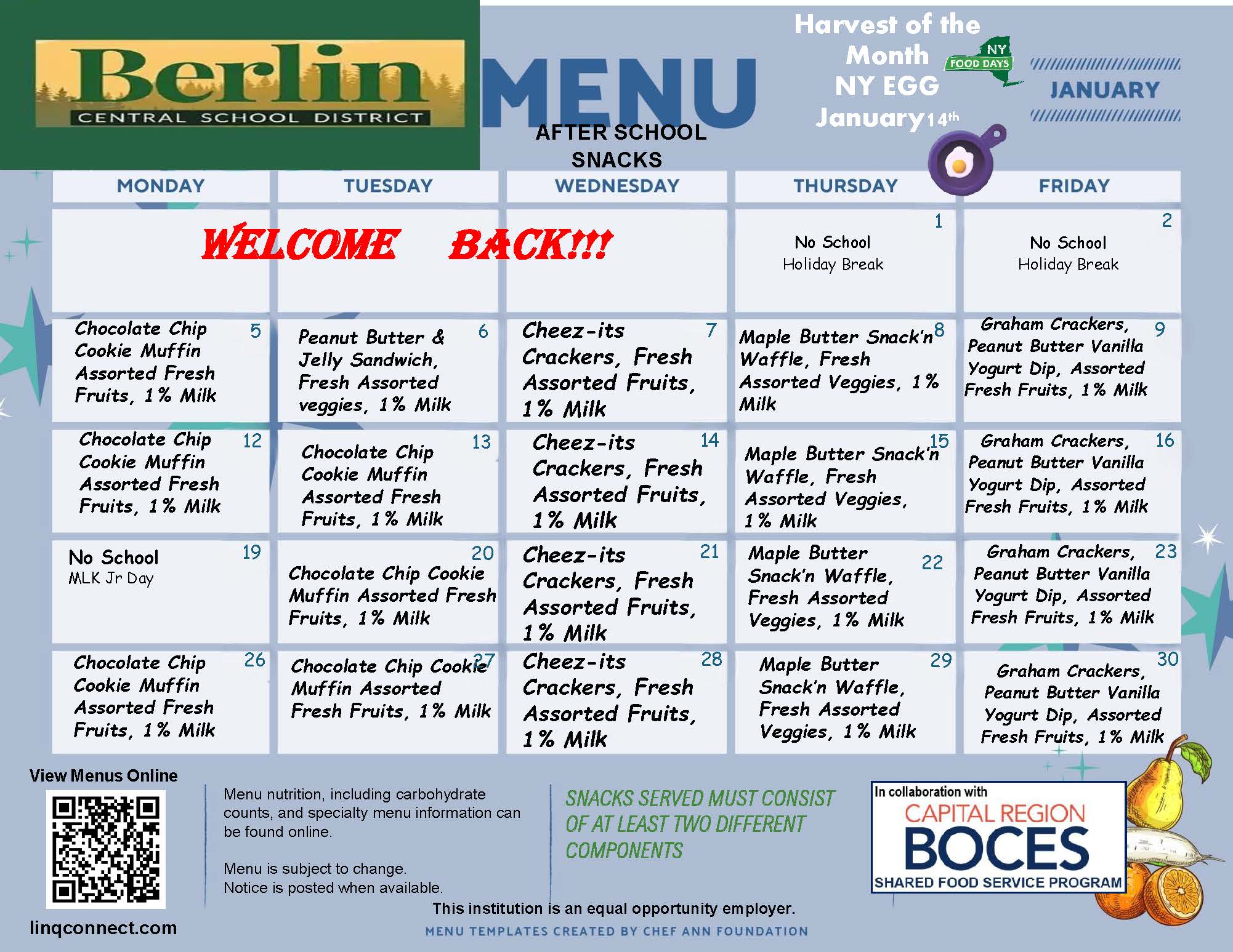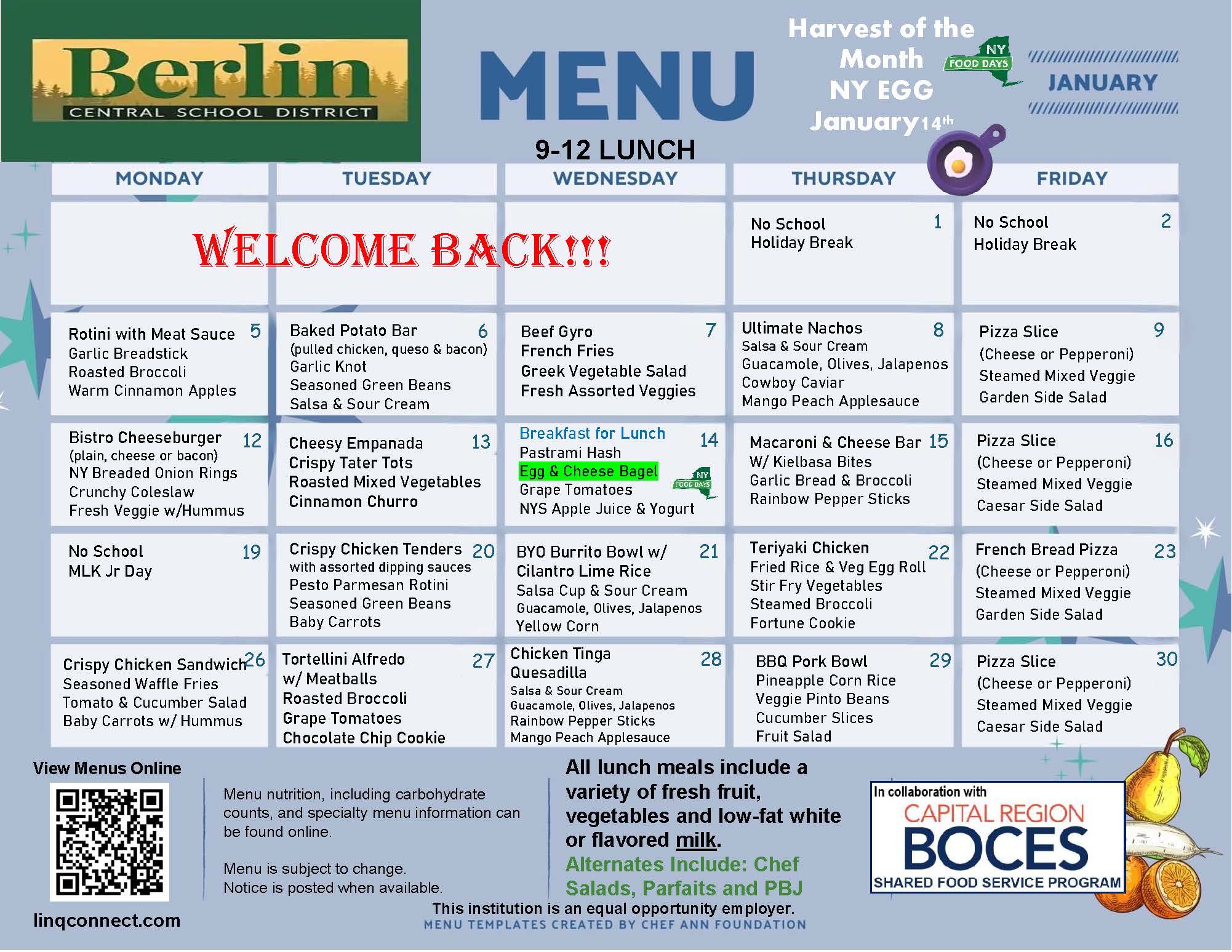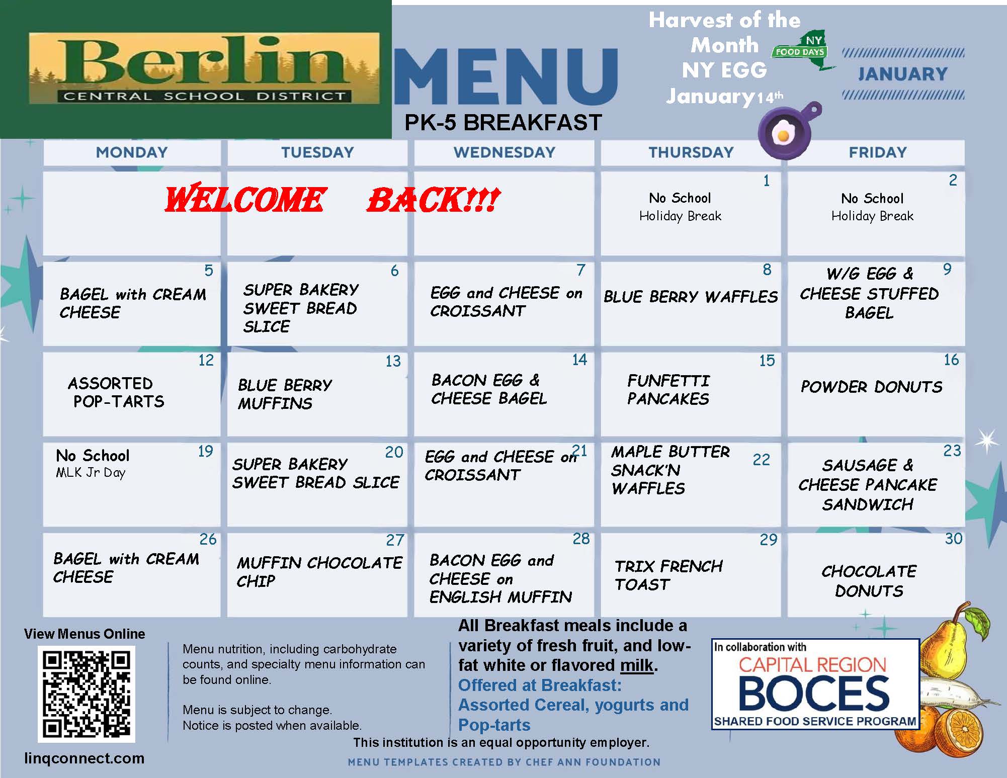 All Berlin Central School District students are eligible to receive FREE school meals (1 breakfast and 1 lunch per day), regardless of family income, through the Community Eligibility Provision (CEP). Additional meals, snacks and a la carte items will still need to be paid for. Students will be able to purchase those items with cash or funds available on their LINQ Connect accounts.