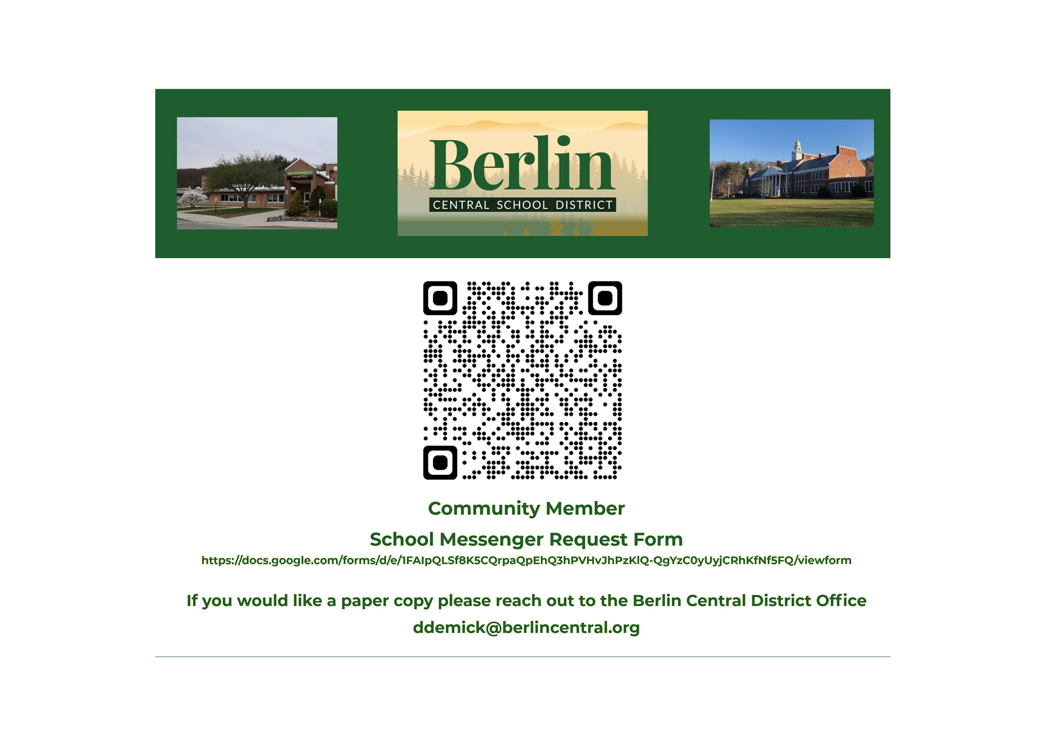 Are you interested in opting into receiving important information about Berlin CSD? Last year, the district established a Community School Messenger list where community members could opt in to receive notices about school budgets, events, and other important community notices. Please find more information here and consider signing up.