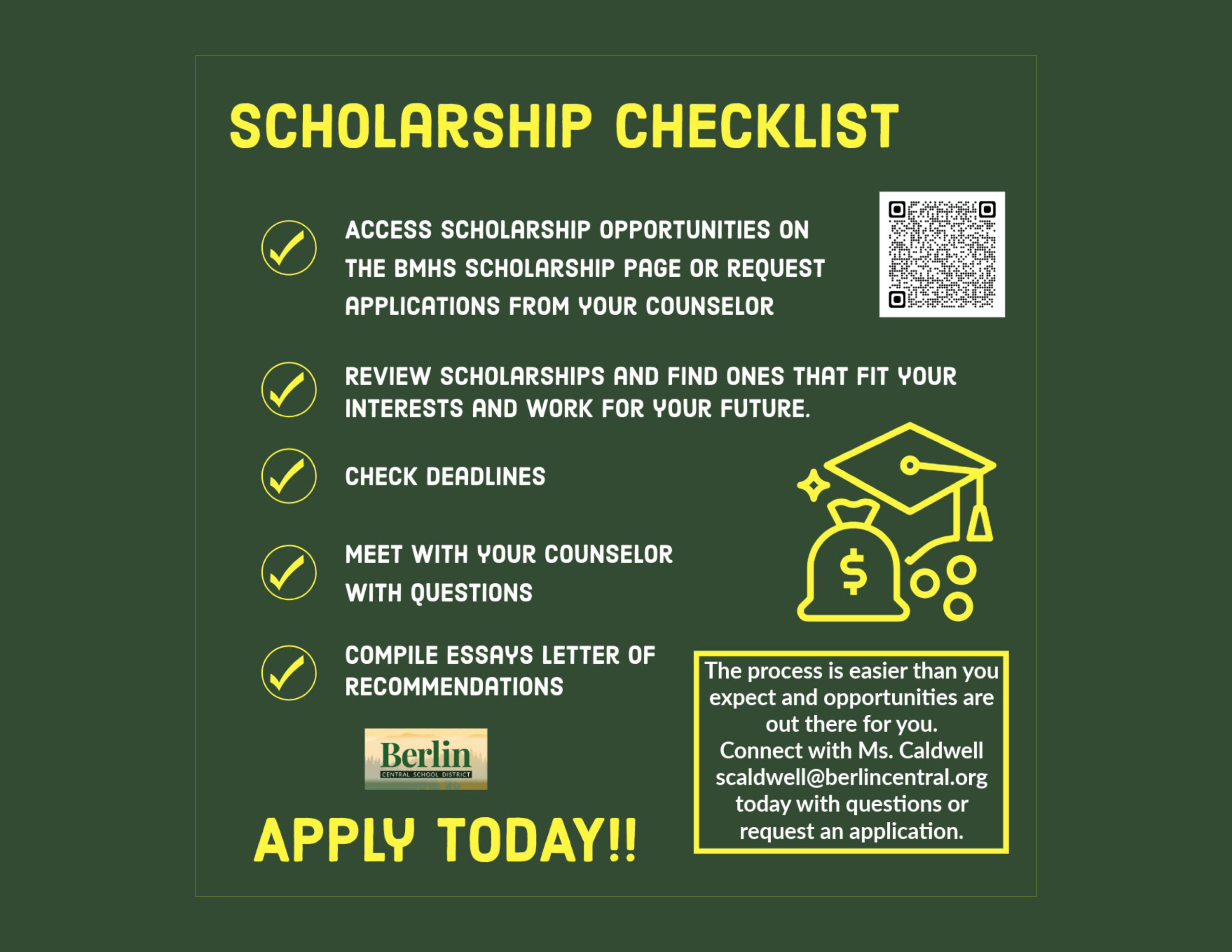 Scholarship funds will be sent directly to the recipient upon successful completion of the 2026 fall semester. Send/email a verified college transcript to Mary Ellen Caporta at the address above.
